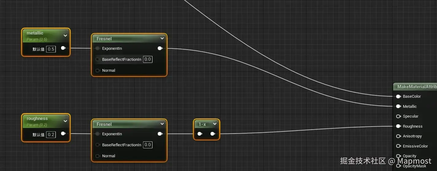 创建两个“Fresnel”节点新建两个变量输入到指数节点上用来制作水体的金属度和粗糙度,还原水体反光的质感。当连接到粗糙度上时,需要用一个“减一”节点反转输出的值,因为粗糙度的材质值表现与金属度相反,值越大越粗糙,值越小越光滑。