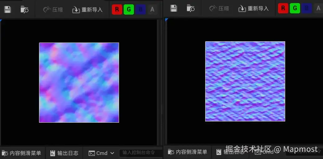 首先,在虚幻引擎中创建一个新的材质,并命名为“M_Water”。完成这步操作后,我们分析一下湖水的特点,那就是水流波纹。水流波纹是逼真水材质的重要元素。为了制作水流波纹效果,我们需要用到更改模型法线朝向的方法来模拟波纹的不同朝向的效果,所以我们需要用到水波法线贴图。为了更好的模拟水流波纹,这里我用到了俩张不同的贴图用来叠加效果,制作更丰富的水面效果。