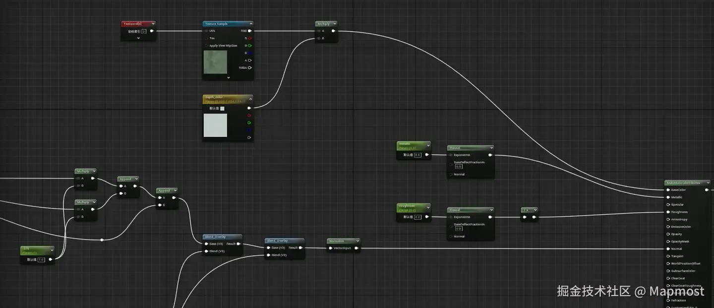 后面我们完善BaseColor的效果,照一张接近湖色的有明暗过渡的贴图作为底色,将其乘上一个Color变量用来调整明度和色彩。