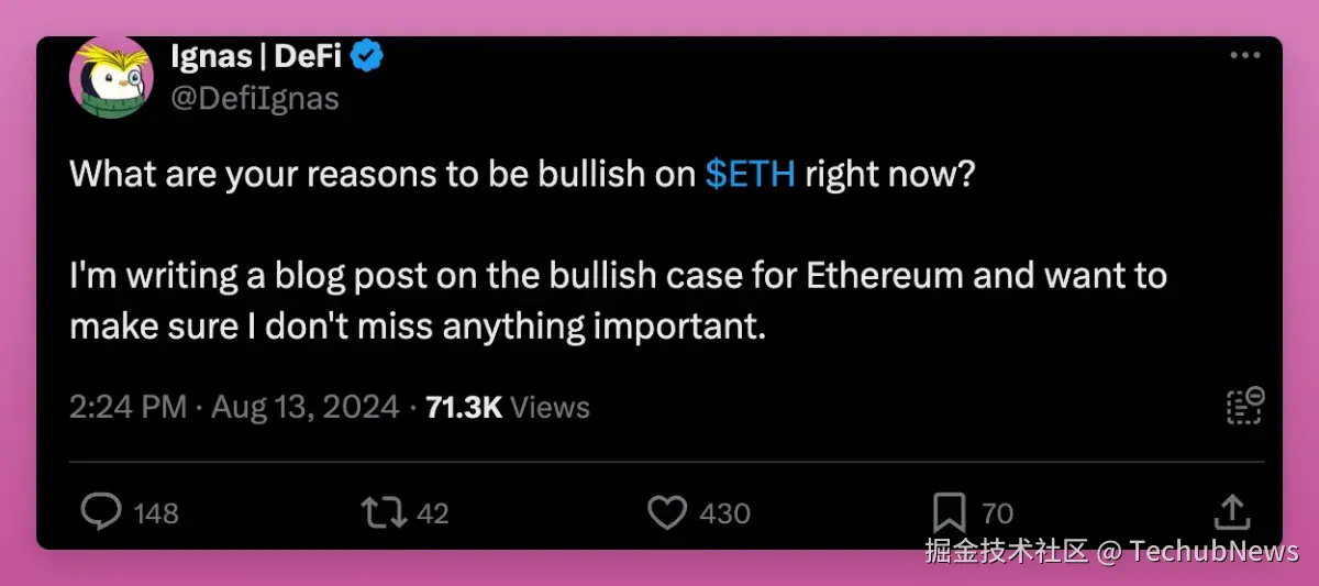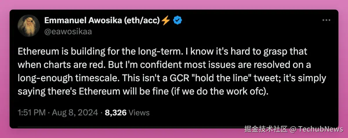 如果您需要更多看到更多的看涨观点与理由, 请查看下面 Emmanuel 的帖子。他之所以看涨, 是因为以太坊拥有强大的社区、持续的创新和长期的适应性。
