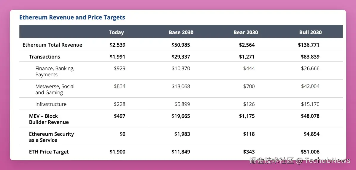 - 预计到 2030 年, 以太坊的收入将从每年 26 亿美元增长到 510 亿美元。这一增长归因于交易费用、MEV 的增加以及「安全即服务」(SaaS)的推出,即使用以太坊质押来保护其他协议(restaking)。