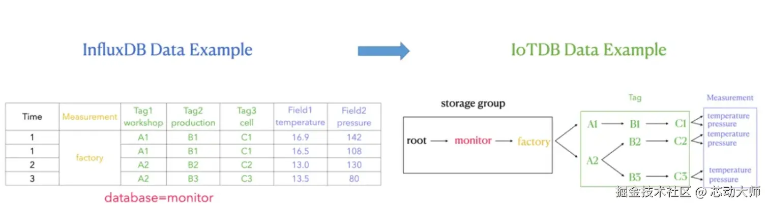 我们在 IoTDB 中使用 database 和 measurement 之间的路径来表达 InfluxDB tag 的概念,也就是图中右侧绿色方框的部分。
