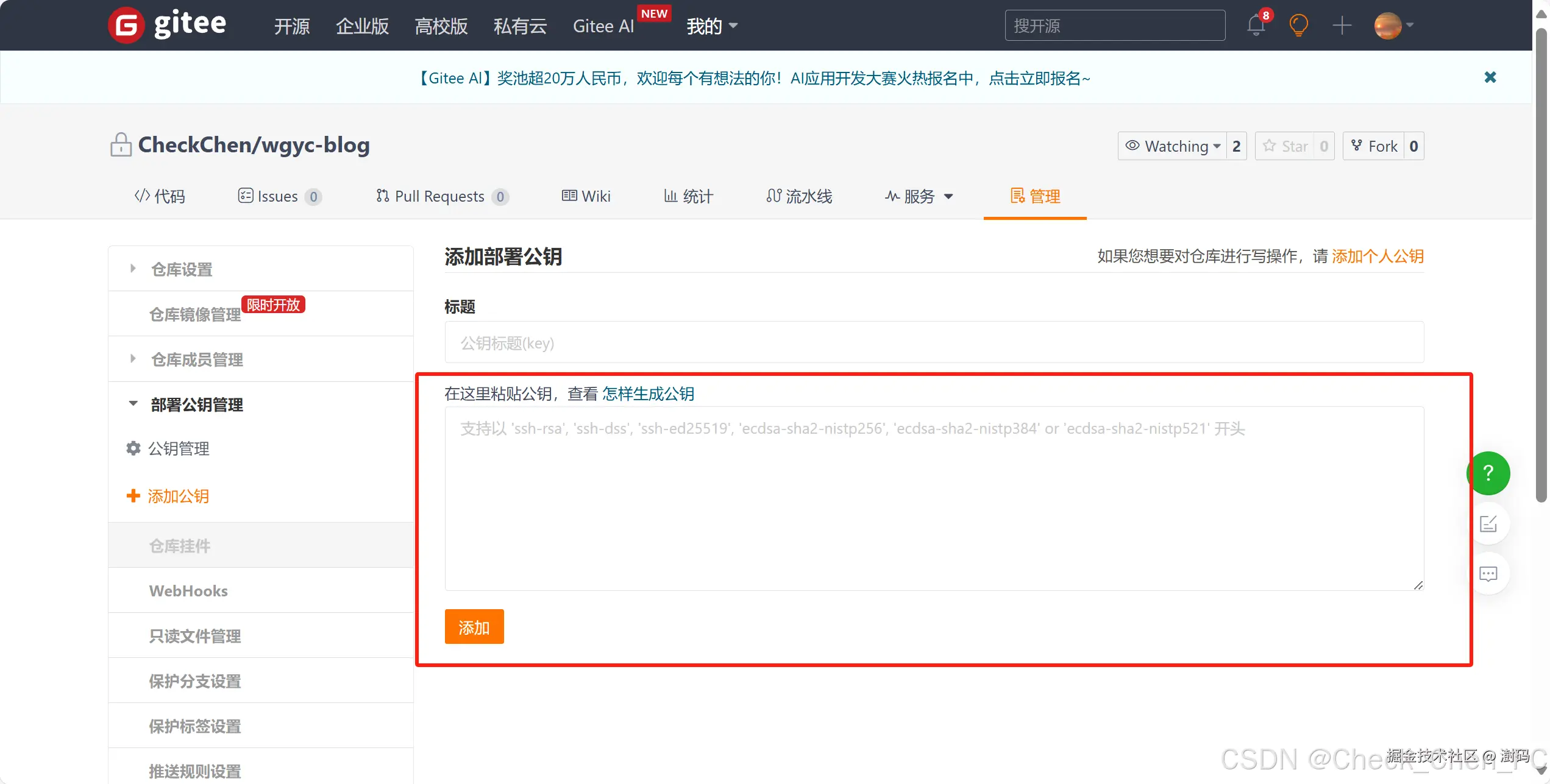 2. 配置 Gitee 仓库的 部署公钥