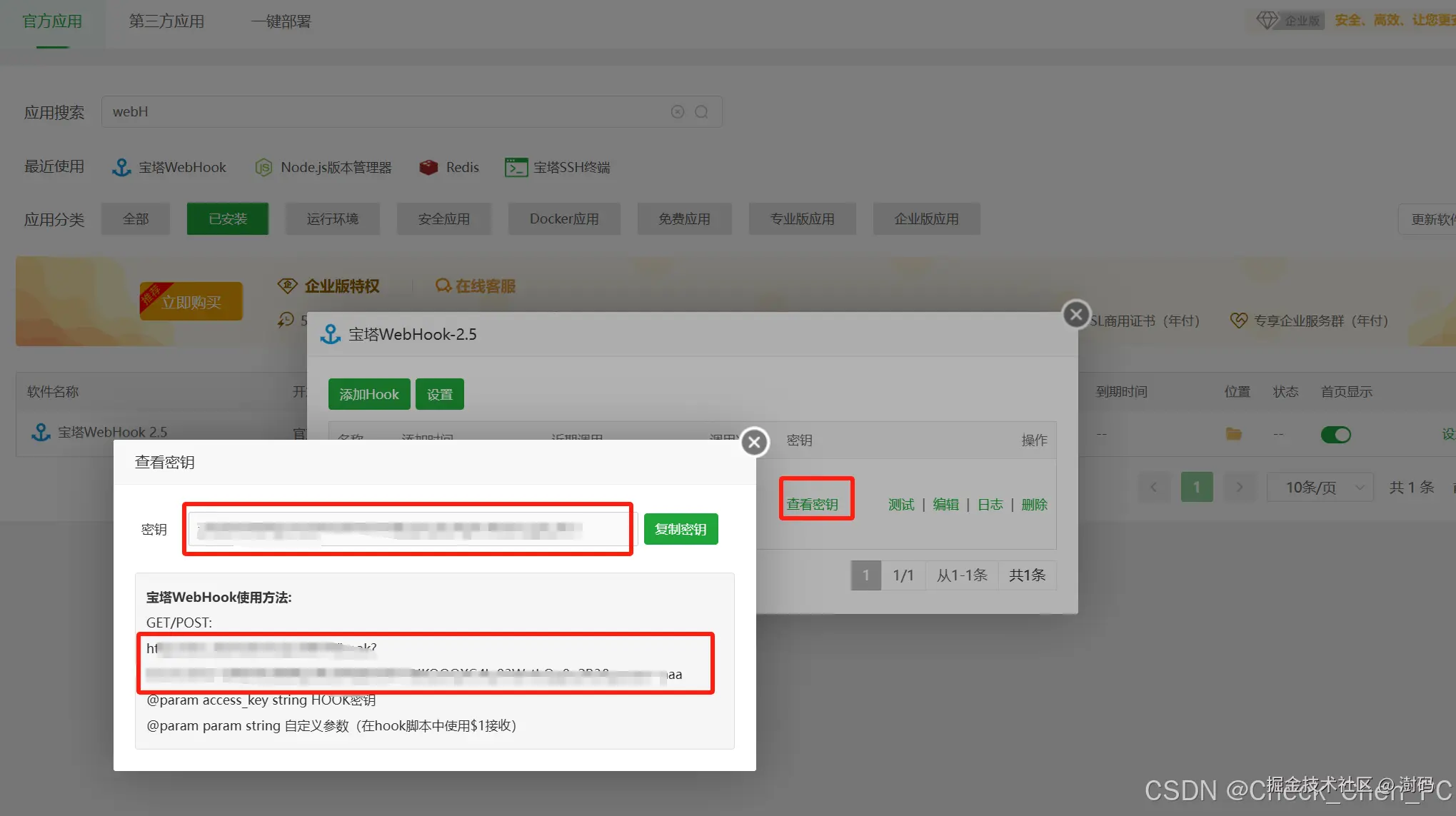 - 复制宝塔WebHook 提供的URL和密钥