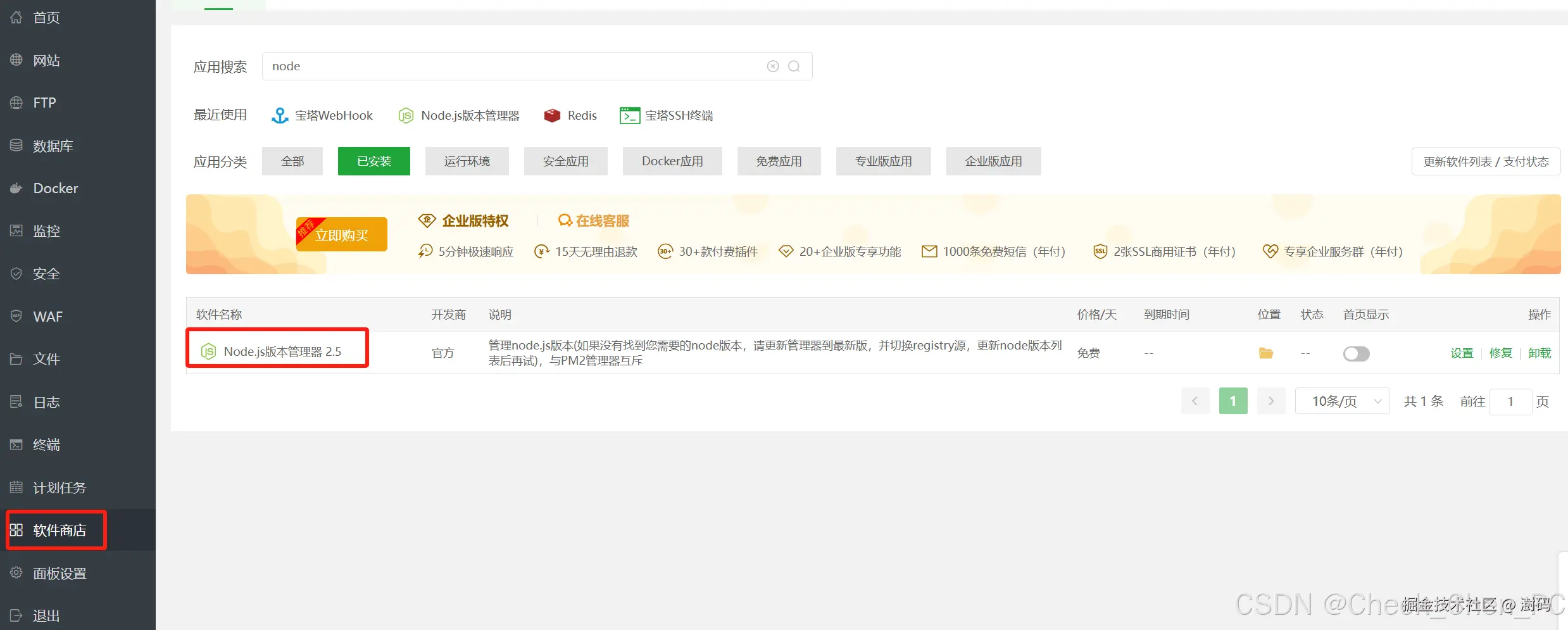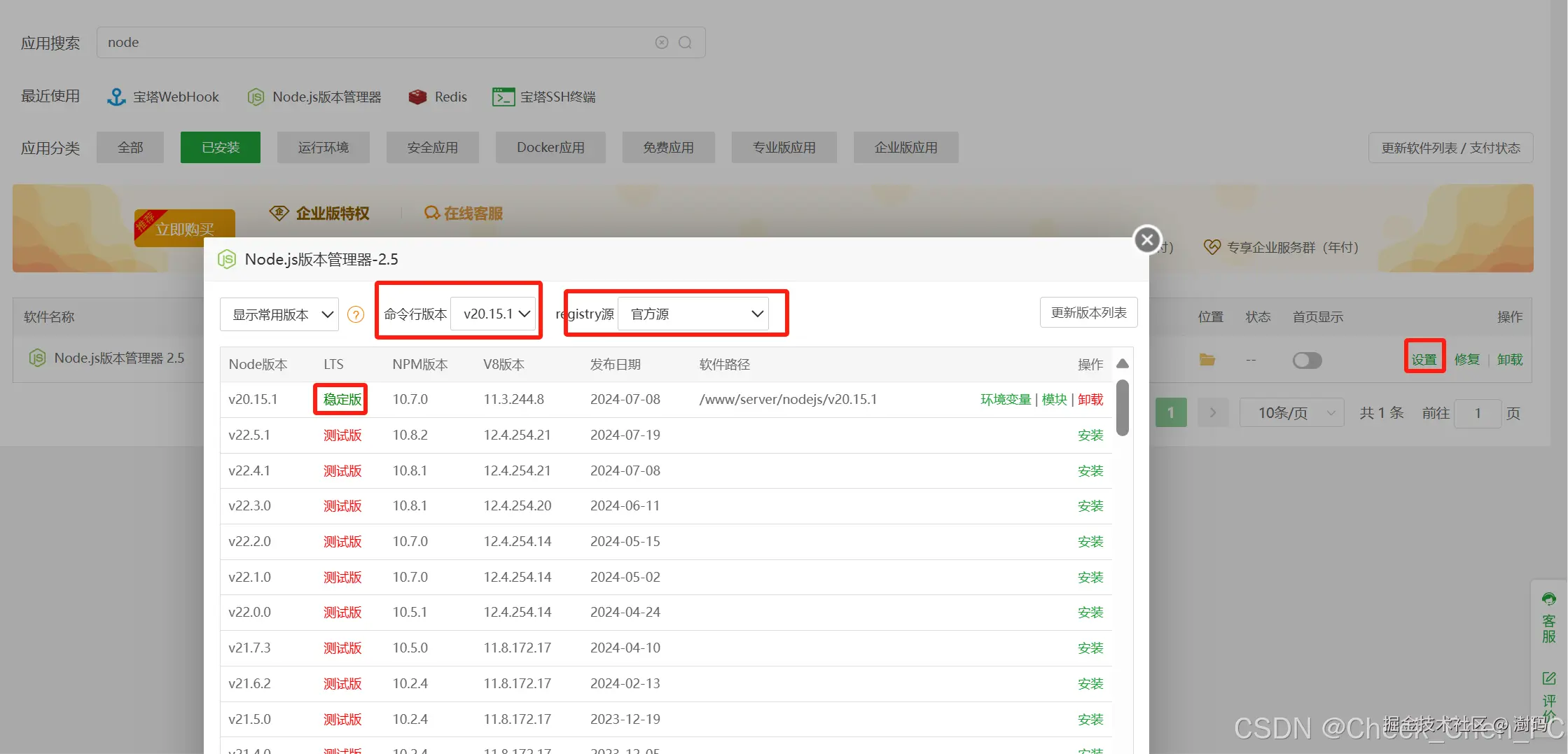由于VuePress对Node.js版本有特定要求(推荐18+),我们需要在宝塔面板的Node.js版本管理器中安装相应的版本。同时务必设置命令行版本,以避免版本不可用或冲突的问题。