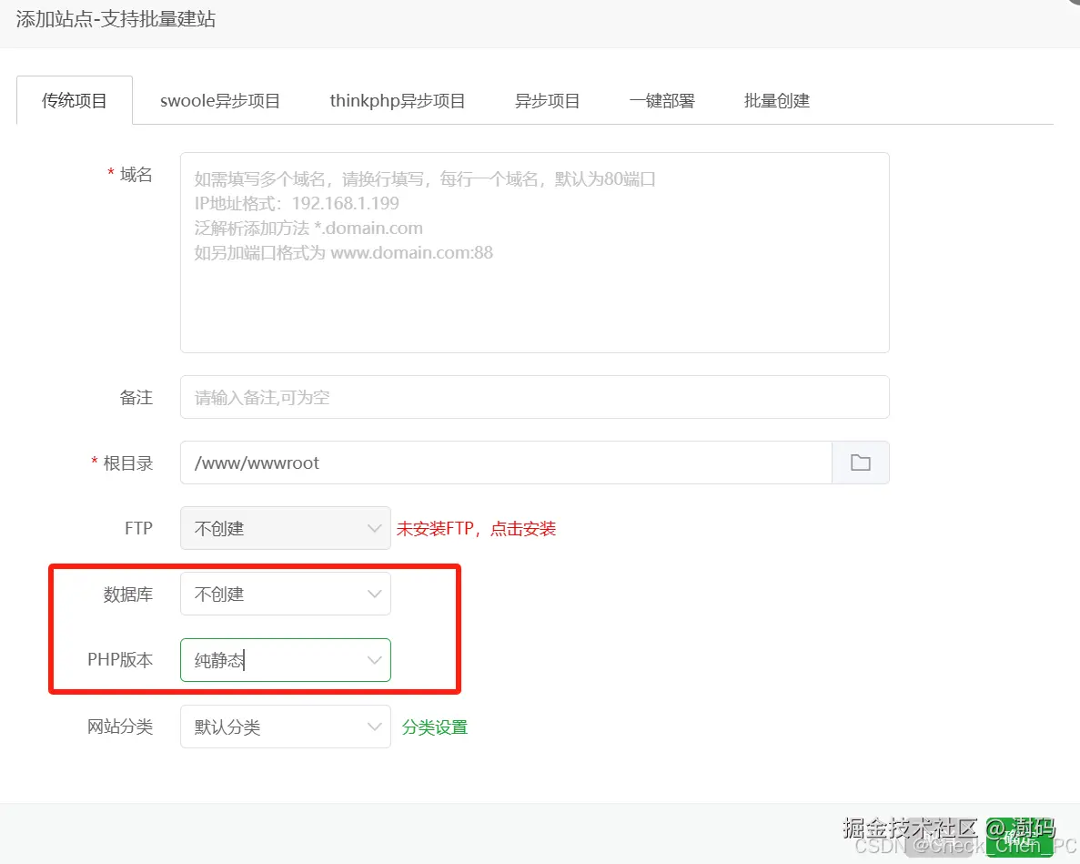 - 数据库选择“不创建”,PHP版本选择“纯静态”。