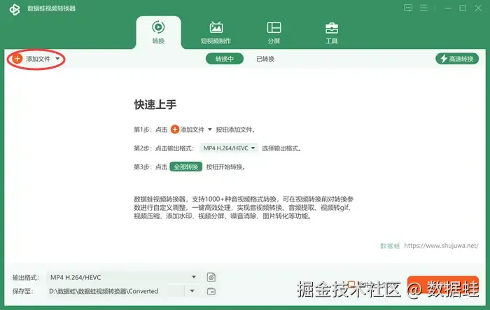步骤一: 安装下载好数 据 蛙视频转换器后,在界面中点击 【+添加文件】 导入目标视频文件。