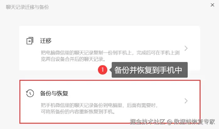 步骤:在电脑上登录微信,点击左下角的三条横线图标,选择 【备份与恢复】>【备份聊天记录至手机】 ,按提示完成备份恢复即可。