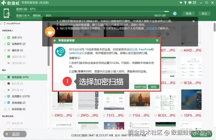步骤2:扫描中可以允许软件进行加密扫描,让数据扫描得更彻底,同时软件也会保护您的个人隐私,不泄露任何数据。