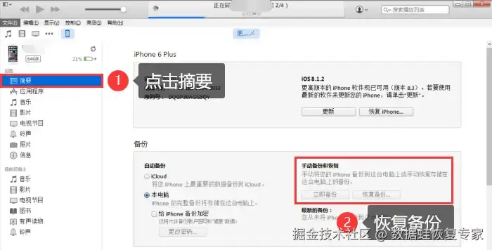 步骤2:在iTunes中找到 【恢复备份】 选项,选择包含微信数据的备份文件进行恢复。