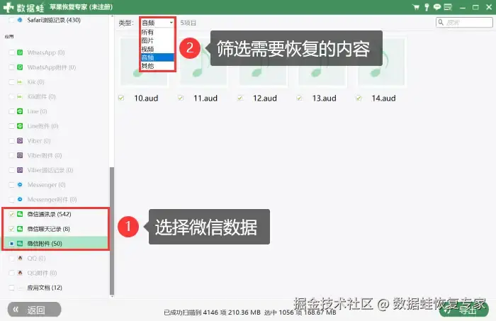步骤3:扫描完成后,在软件左侧选择需要的微信数据进行恢复,还能自由筛选数据,免去查找的麻烦。