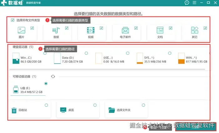 第1步: 打开软件,选择需要恢复的数据类型和路径,点击“扫描”。
