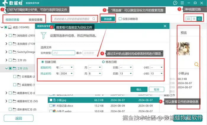 第2步: 扫描结果出来,用户可以选择直接勾选目标文件,或者使用搜索框直接定位目标文件,也可以选择使用“筛选器”通过文件的创建时间或修改时间对搜索文件的范围进行限定。