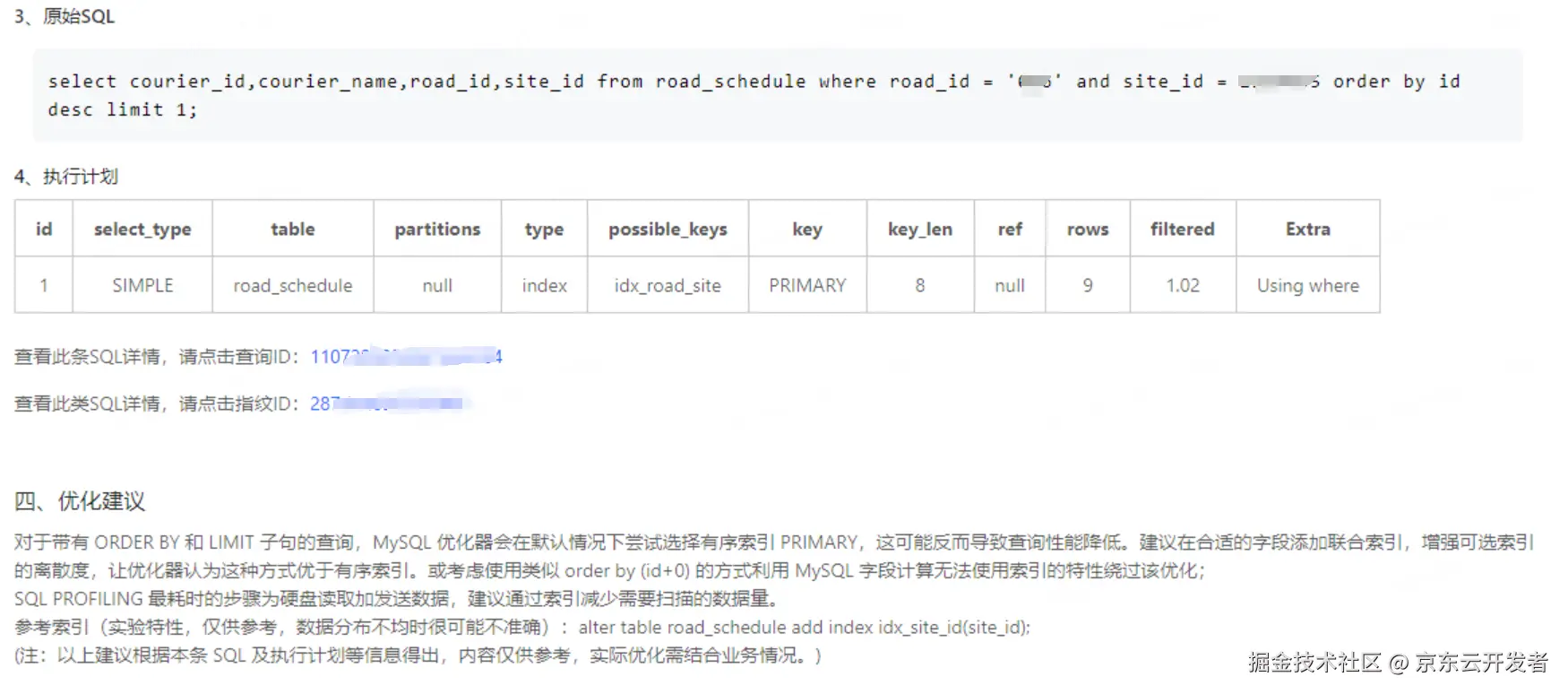 对比两个执行计划又都用到了idx_road_site索引,所以猜测按id排序肯定会快一点