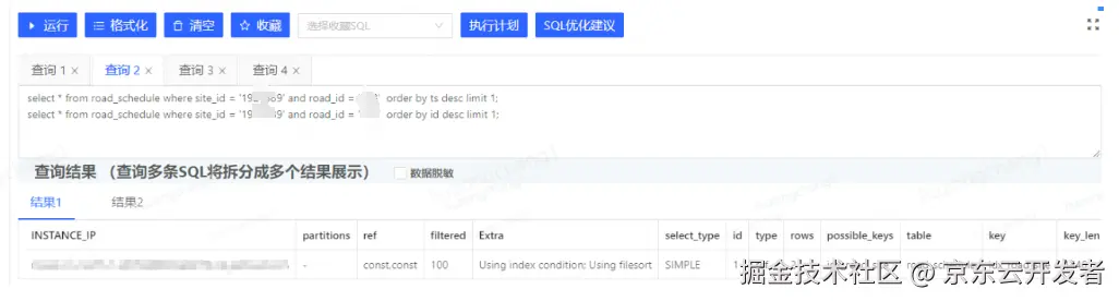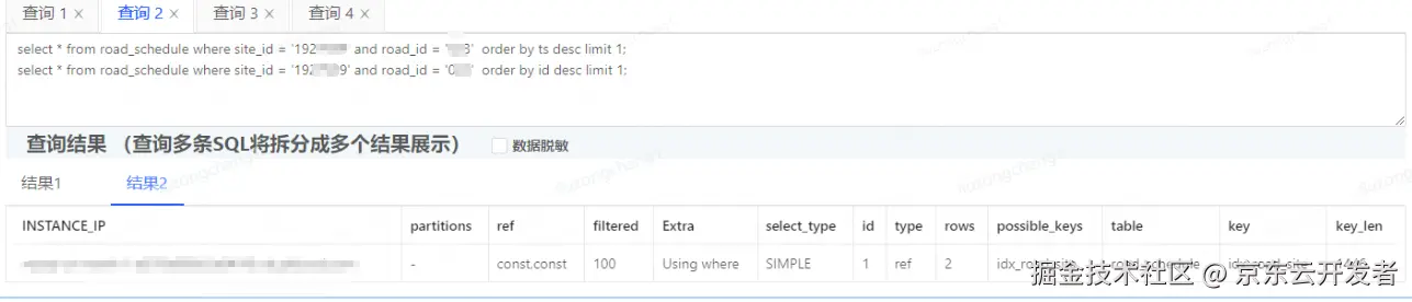 虽然没有慢sql出现,但还是分析了下sql。经分析sql 查询是不是用了索引,发现查询字段也是“走了idx_road_site索引”的(注意这里是引号,其实索引并未完全生效)