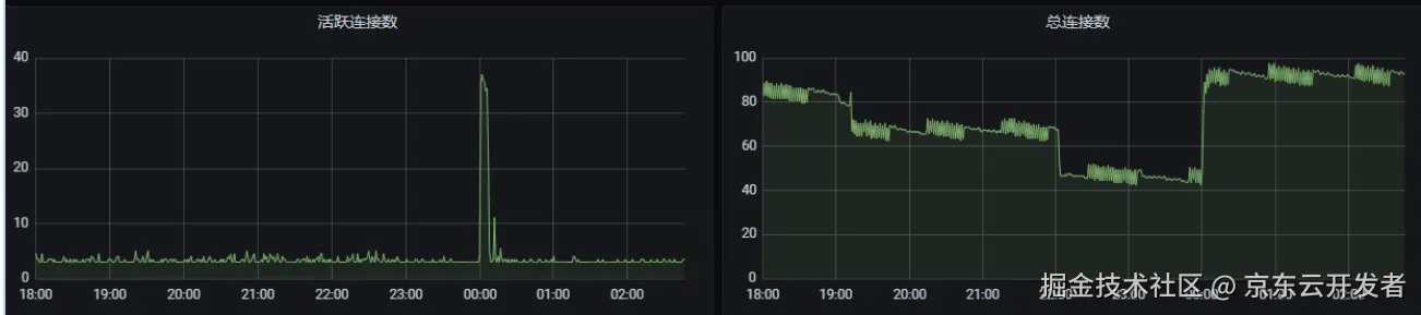 从上图mysql监控发现0点时连接数突增,所以分析是不是有没有提前创建数据库连接。修改应用连接池配置,单应用最少空闲连接为50,应用有4个实例,这样整个数据库连接数在4*50=200个以上,大于图中突增后的总连接数100