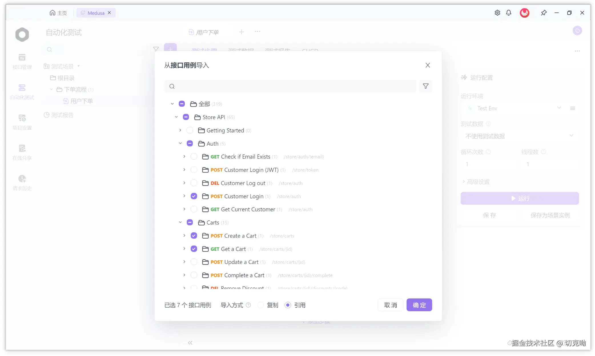 Apifox 在这里的设置就很有趣,因为测试用例已经编写了,我可以直接导入相关的接口即可,它会自动与最新接口文档保持同步。
