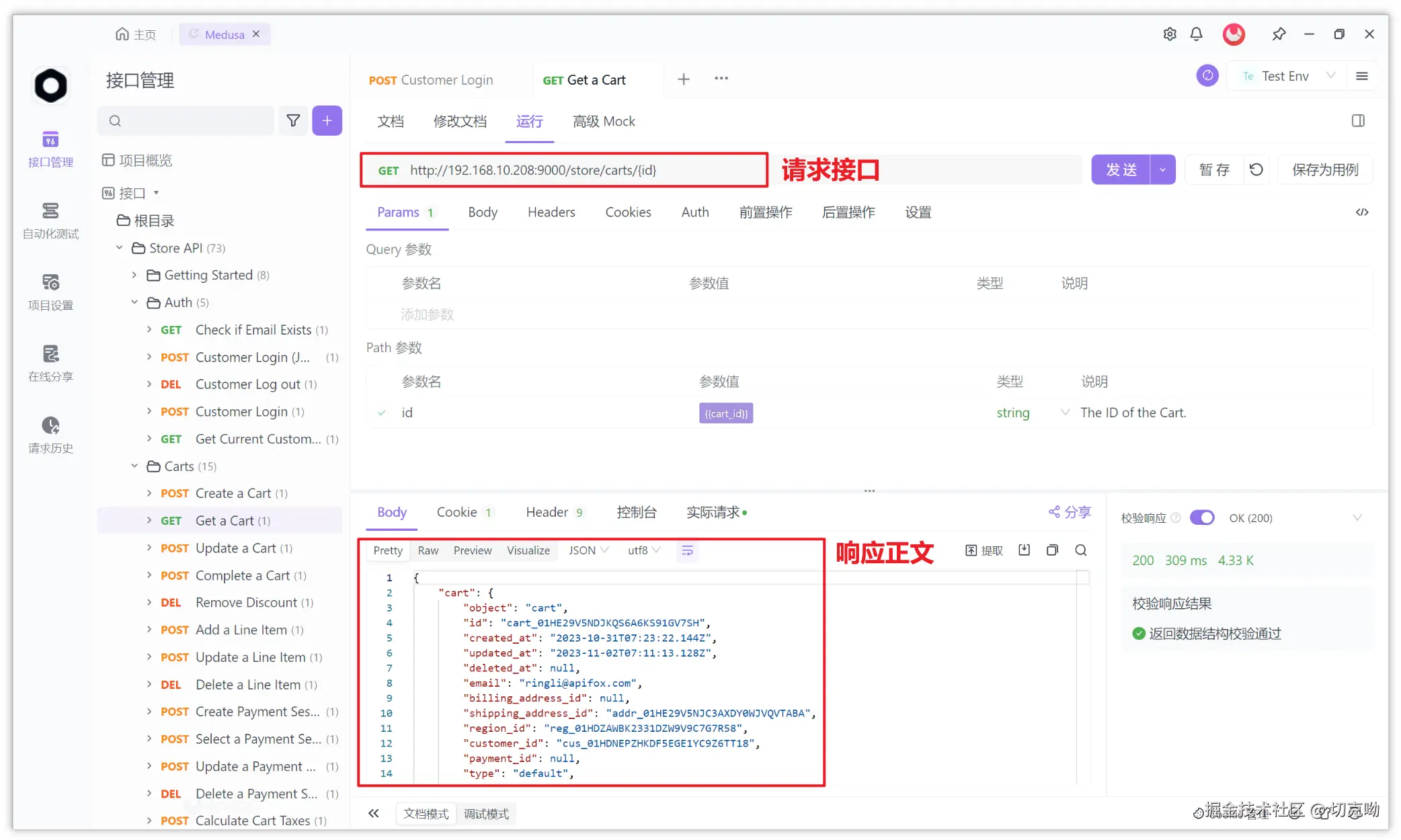 Apifox 自动化测试能力里,有一个非常好用的功能,就是可以直接读取上一个步骤的数据。比如我在购物车信息的获取需要用到 id,我就可以直接引用前置步骤(创建购物车这一步)的响应,把前置响应的 id 值通过 JSONPath 表达式提取出来,非常简单非常方便,这个功能真的很值得称赞!