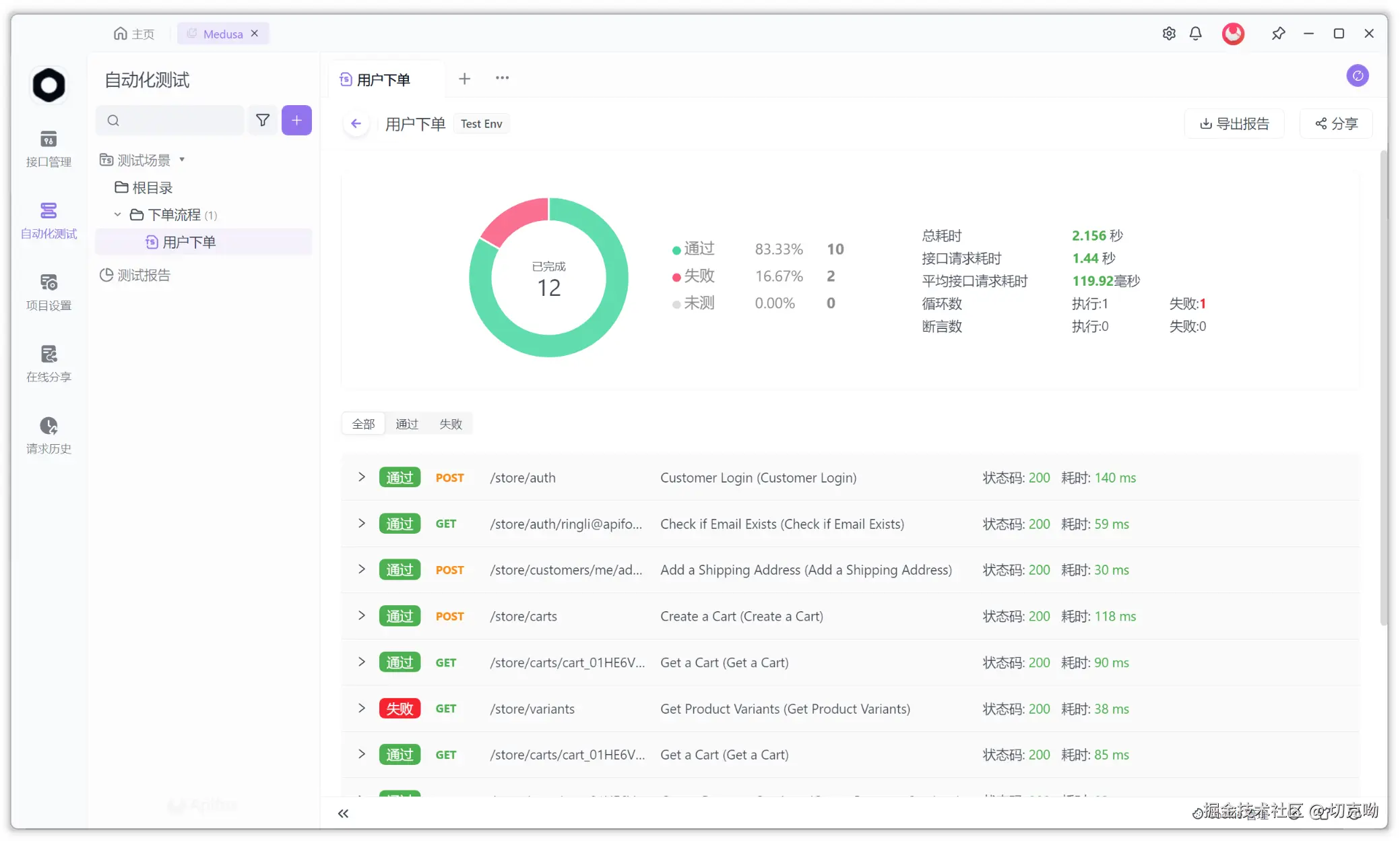 完成步骤编排后,就可以点击「运行」进行提测。在 Apifox 上执行了编写好的所有测试场景,会自动生成详细的测试报告,清晰展示每个接口的请求和响应信息,以及测试结果。
