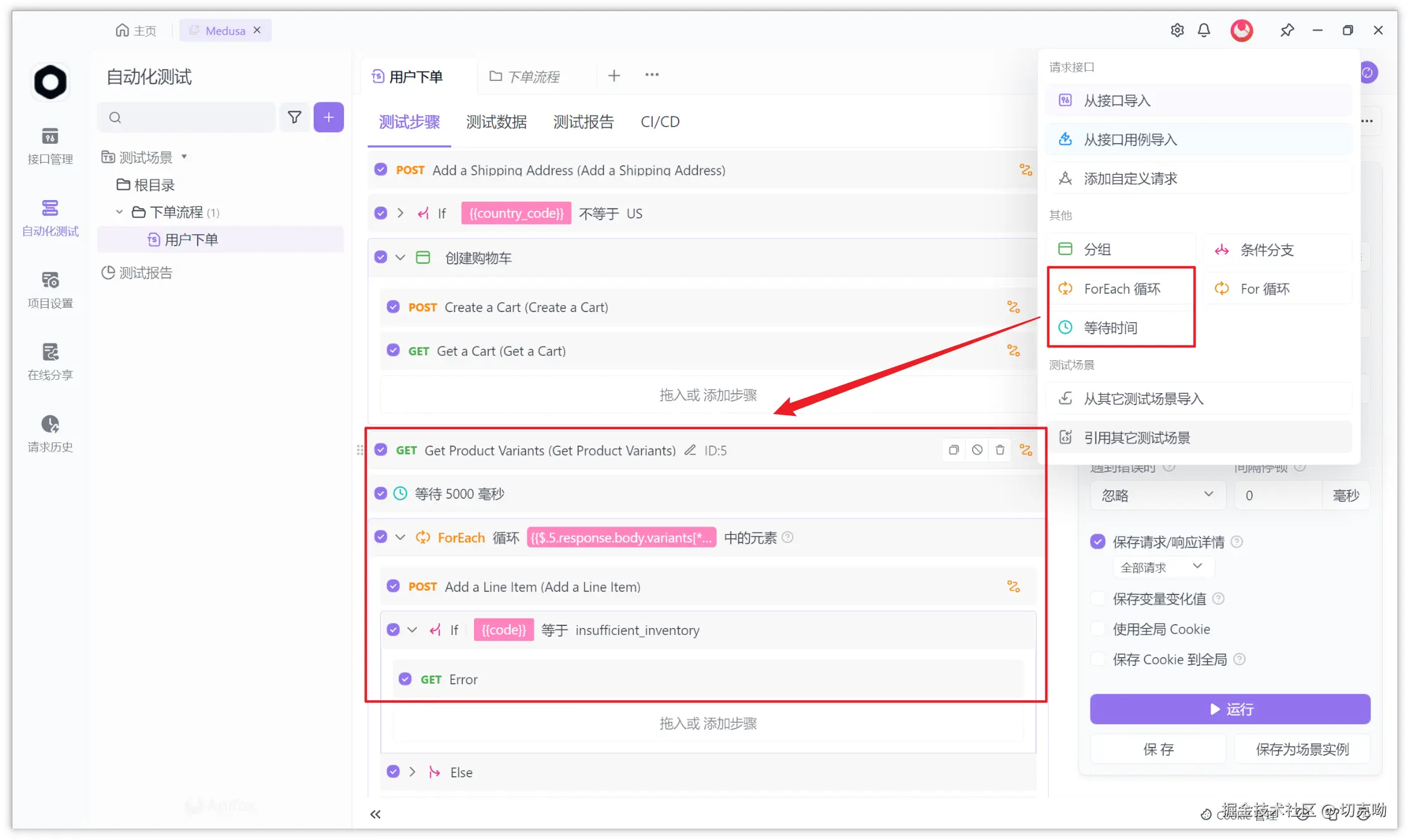 在 Apifox 里,可以直接通过可视化的方式循环步骤。比如商品种类繁多,我就可以用 ForEach 循环遍历商品 id,并在下一步将其作为参数传递,这样就可以完美循环调用接口。还可以设置一个 5000ms 的等待时间,更贴近真实场景。