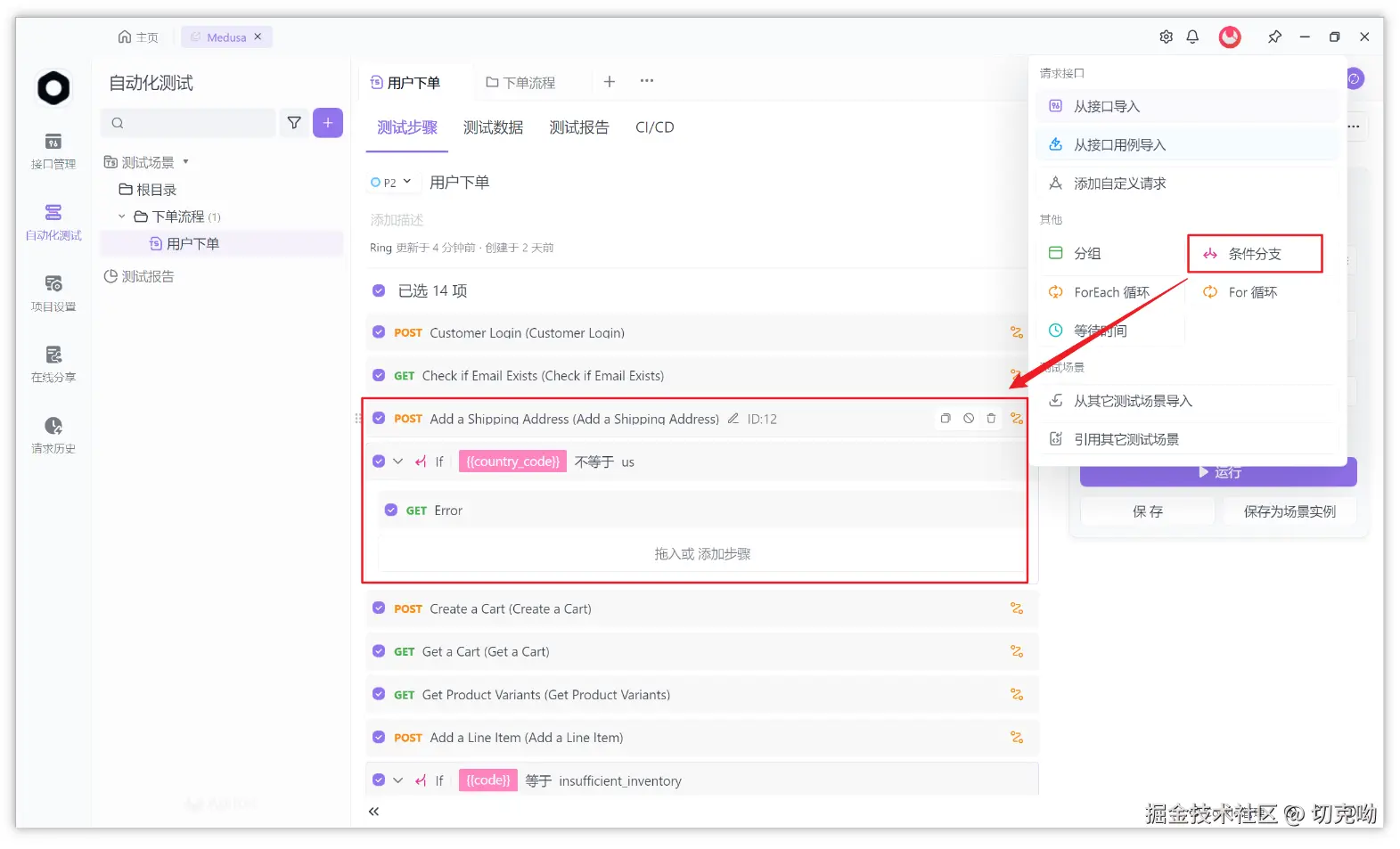有些步骤,可以使用 Apifox 提供的条件分支功能。比如跨境电商项目主要对美区提供服务,所以如果填写的“国家/地区的 2 字符 ISO 代码”不是“US”的话,会提示其重新填写,因此条件分支功能可以处理该需求。