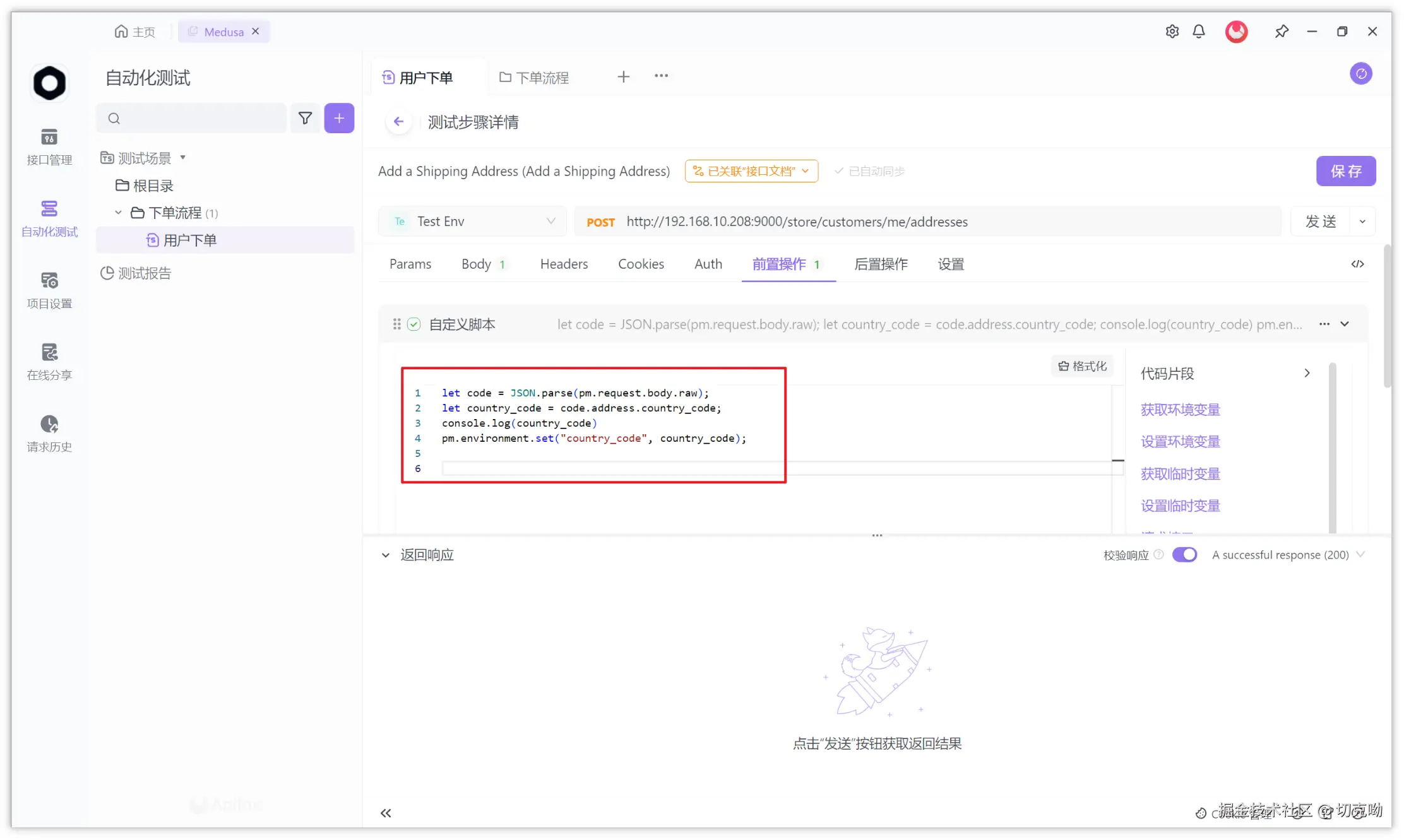 在接口中通过脚本的方式,将“国家/地区码”提取到环境变量里: