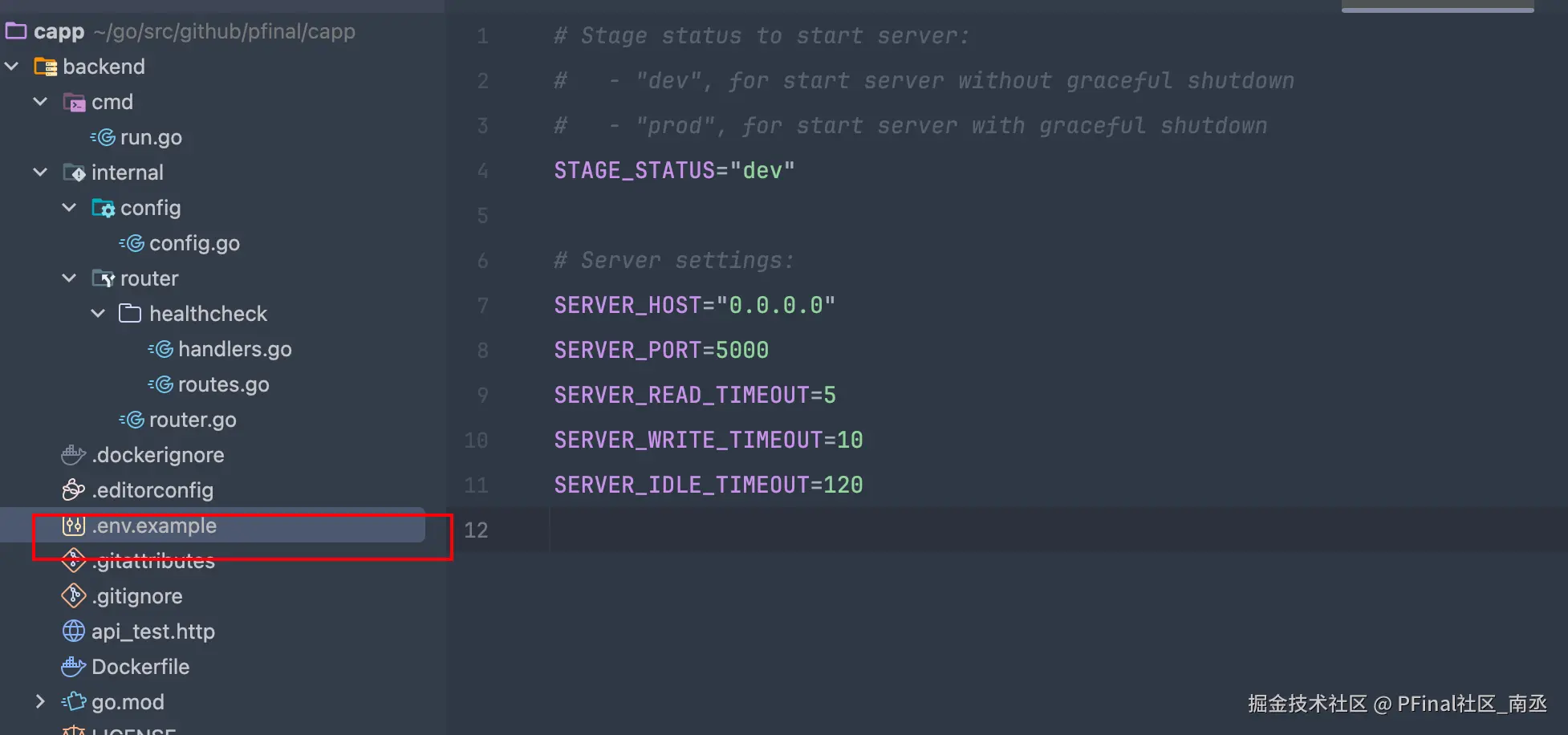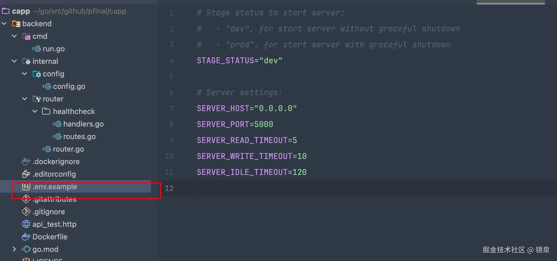 生成的项目自带 .env.example 配置文件。你只需要把这个文件复制并重命名为 .env,然后稍作配置就可以直接运行项目了。