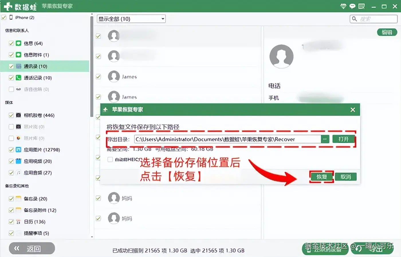 步骤3:根据软件提示,选择通讯录导出的存储位置,等待数据导出完成,即完成通讯录备份。