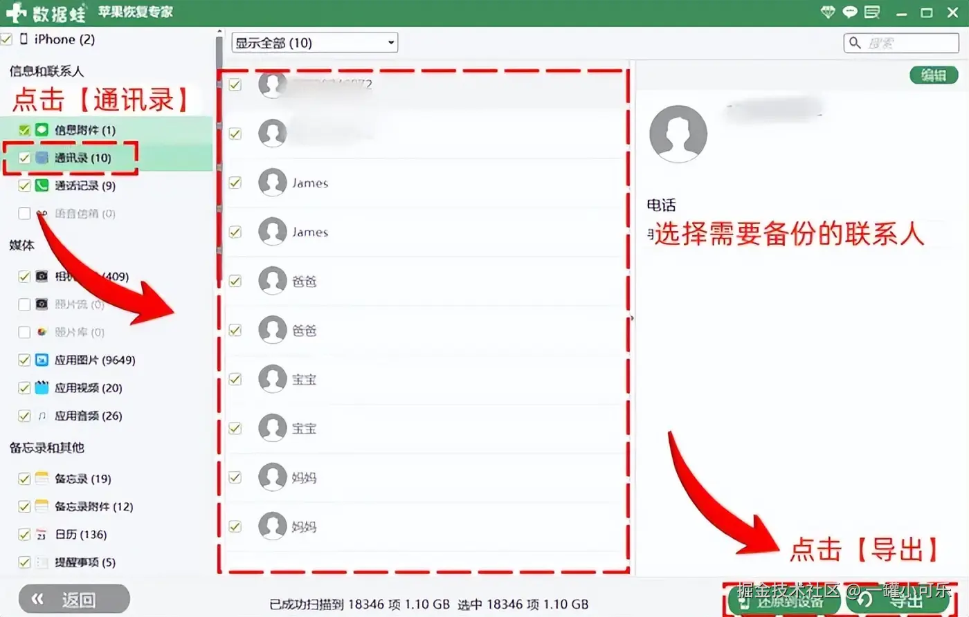 第一个方法就是借助数据恢复工具备份手机通讯录。小编推荐使用数据 蛙 苹果恢复专家来解决苹果手机如何备份通讯录的问题。该软件拥有先进的数据扫描技术,不仅能恢复手机设备中被删除的数据,还能帮助用户备份手机中的一些重要信息,为数据安全提供多一条保障之策。下文,小编就为大家介绍具体的操作方法。