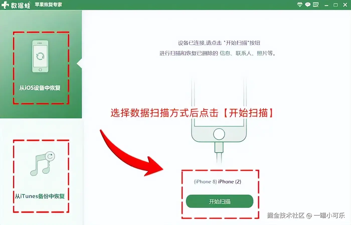 步骤1:运行软件,选择 【从iOS设备中恢复】/【从iTunes备份中恢复】 的数据扫描方式,然后点击 【开始扫描】 。