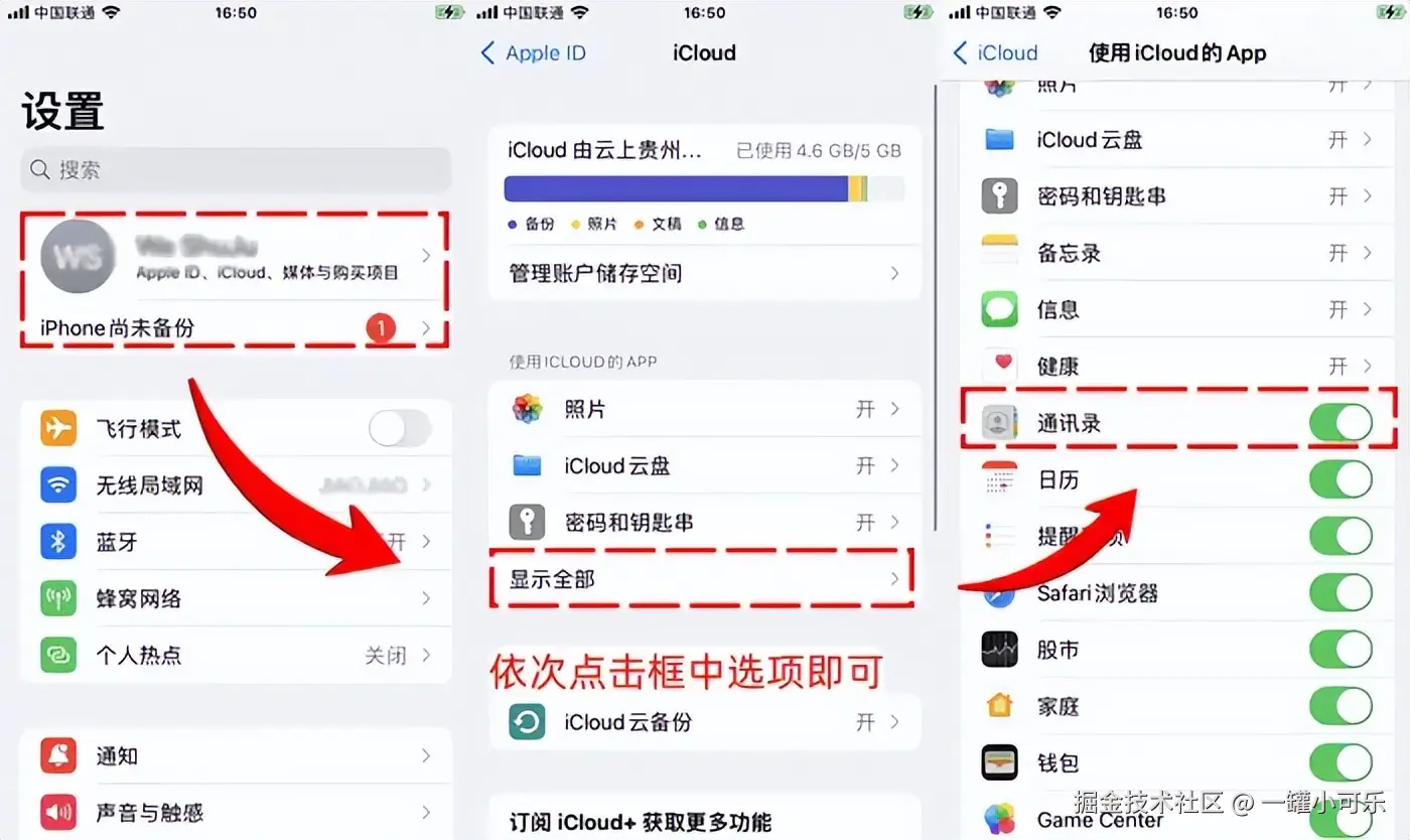 步骤2:点击 【显示全部】 ,打开通讯录的备份按钮即可。