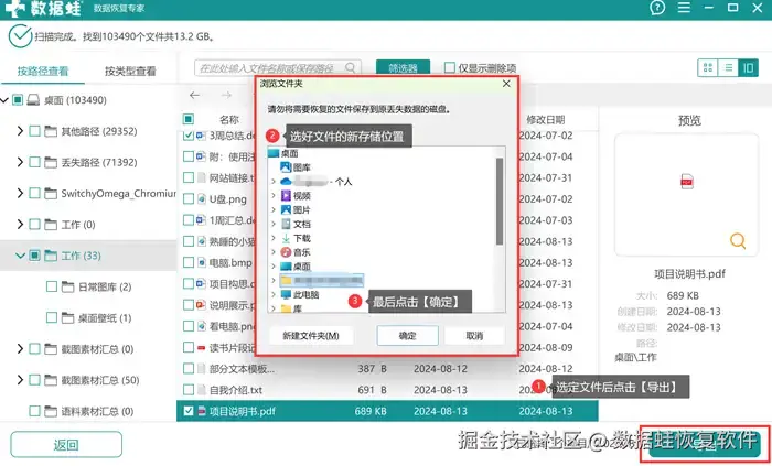 第4步: 最后选定文件点击【导出】,再加上选好新存储位置,完成数据恢复。