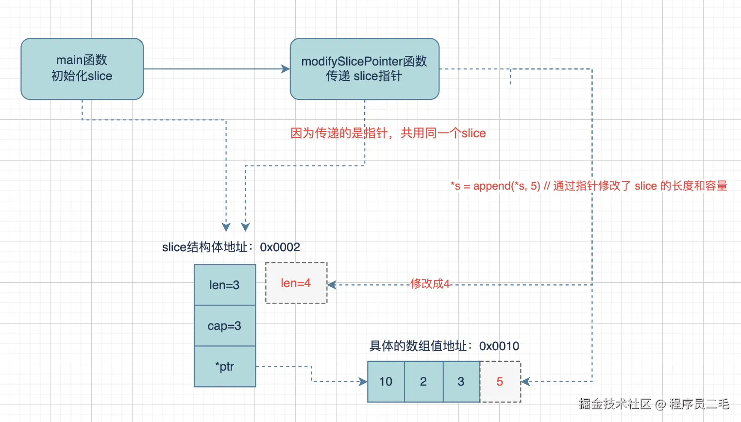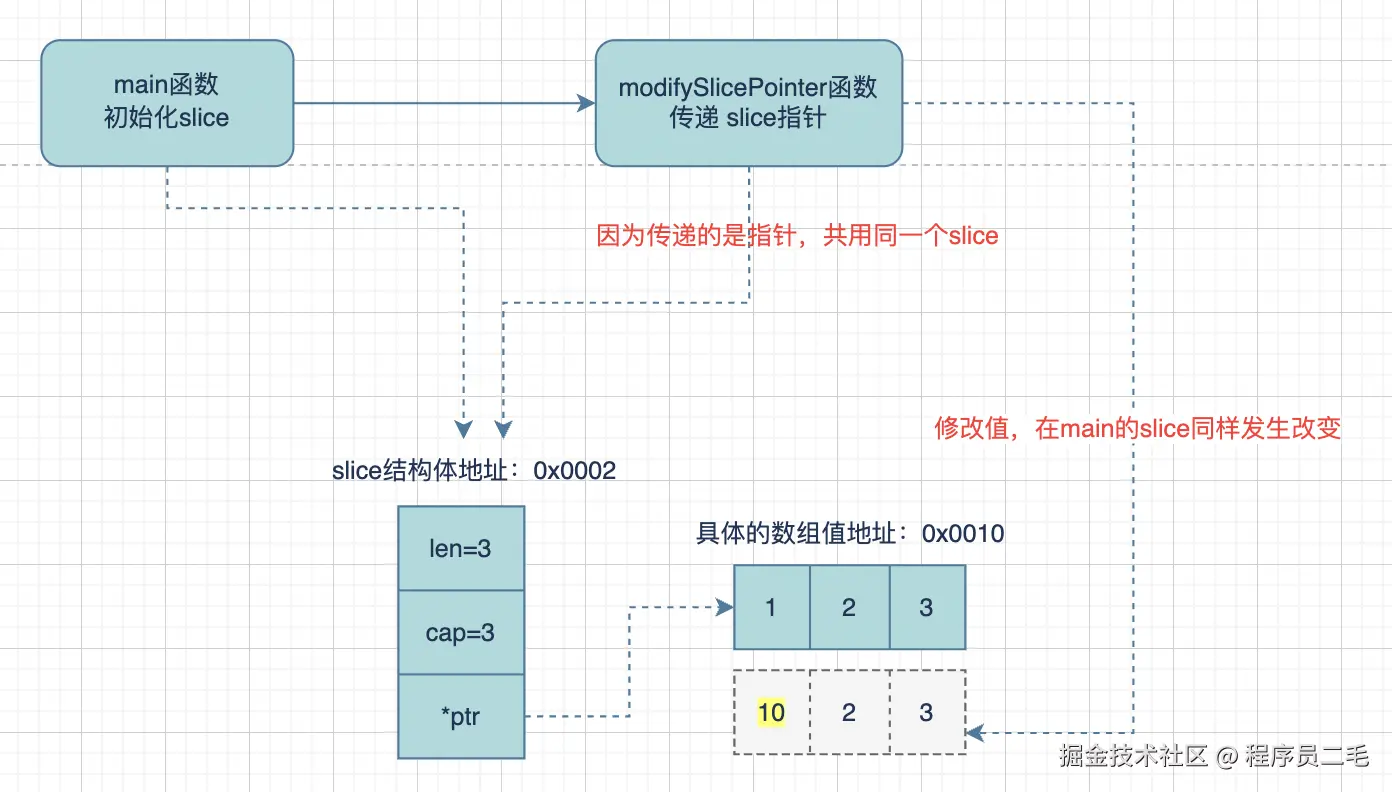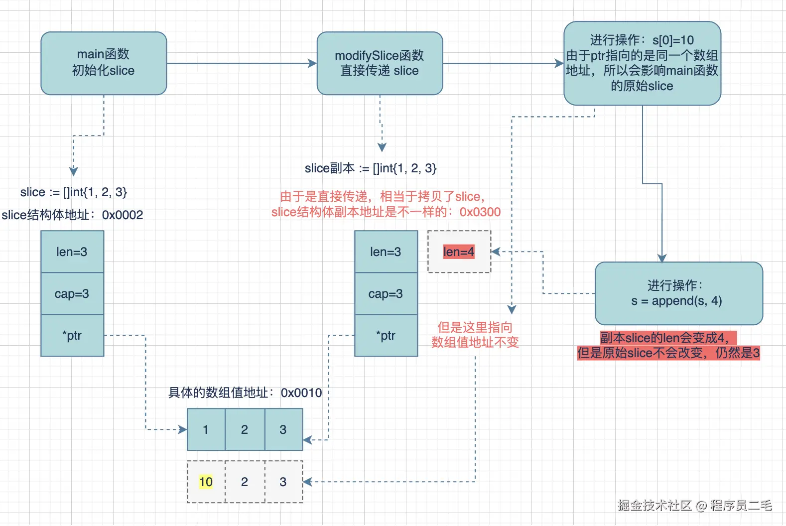modifySlice(slice)直接将切片slice传递给函数。因为切片本质上是一个结构体,传递切片实际上是传递了一个副本,包括指向底层数组的指针、长度和容量。- 在