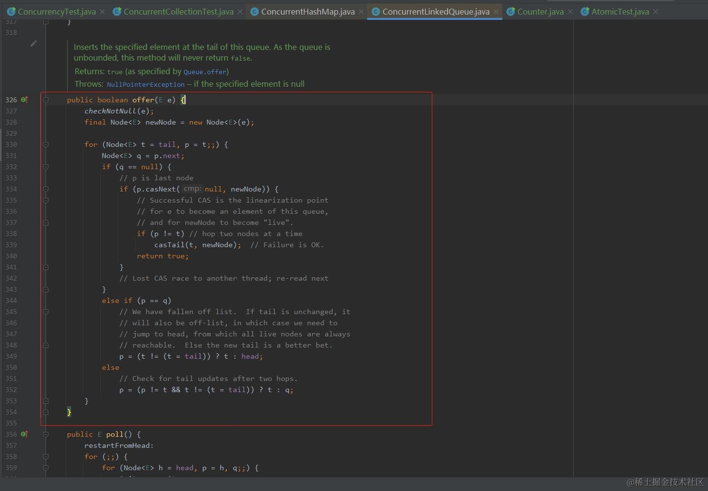我们应该都了解到了一点,ConcurrentLinkedQueue它是一个基于链接节点的无锁队列。部分源码展示如下: