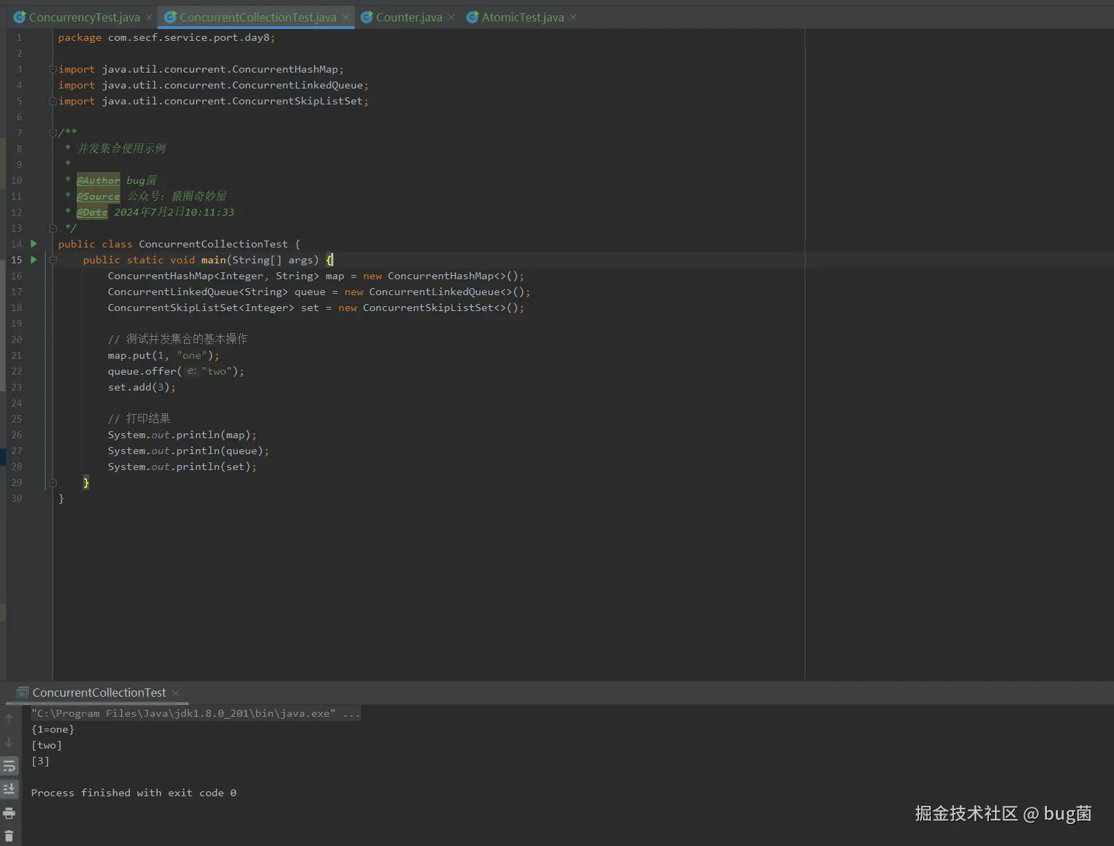 如上测试案例代码主要是想演示三种来自java.util.concurrent包的并发集合的使用,看上去使用起来是不是非常的简单,与常规的集合类使用无二差别,实际上是有区别的,重点就是作用及效果,这点大家需要掌握,而不是滥用,接着可以听我一一解析,首先针对如上三种集合,如下: