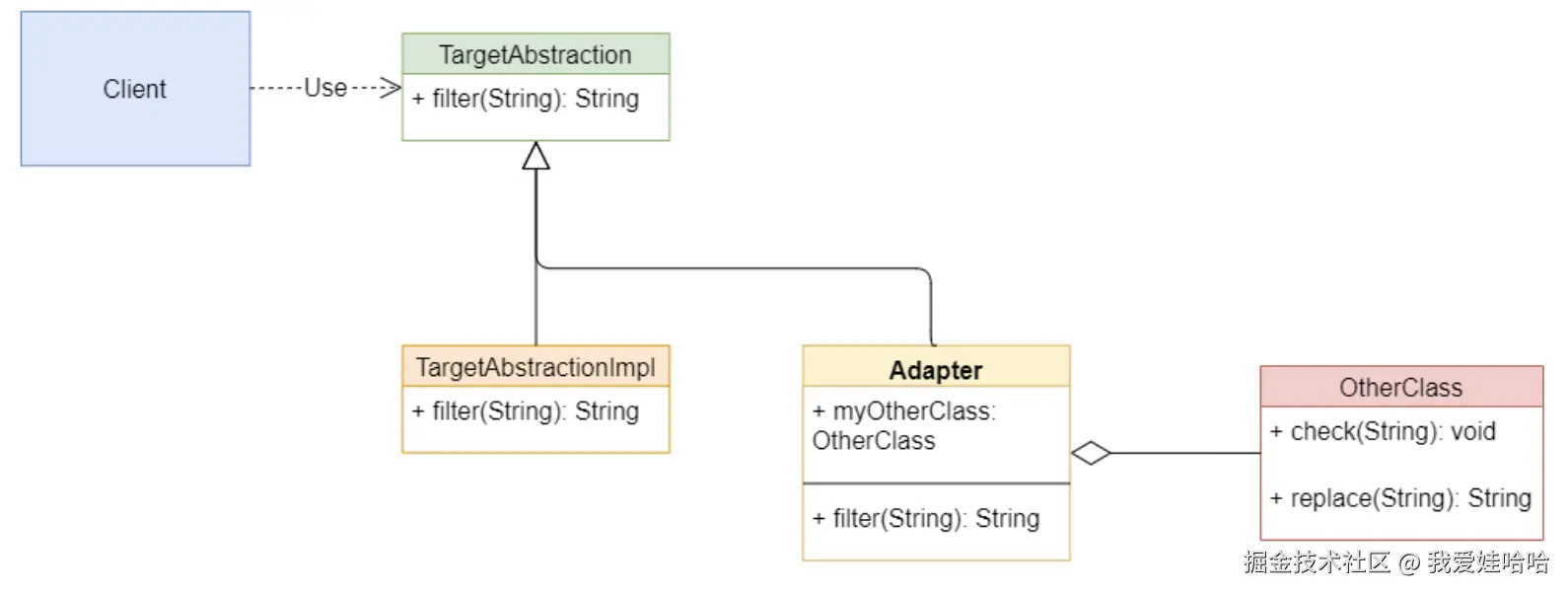 大家可以发现,代码实现中的 Adapter 类充当了一个中间者的角色,Adapter 类继承目标类TargetAbstraction 并实现接口 filter,同时在 fliter 中加入新的扩展功能,扩展功能使用具体适配者类 OtherClass 来实现,这样在保留原有 filter 功能的同时,也增加了新的功能。