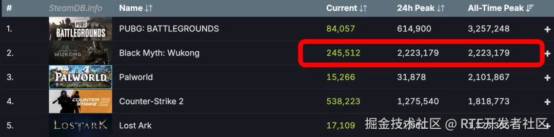 8 月 20 日,《黑神话:悟空》正式上线。游戏上线后即登顶 Steam 热玩游戏榜首,同时在线游玩人数迅速突破百万大关。昨晚,根据 Steam 平台显示,《黑悟空:神话》同时在线人数突破 220 万,超过《幻兽帕鲁》,位居历史峰值人数第二,仅次于《PUBG》。