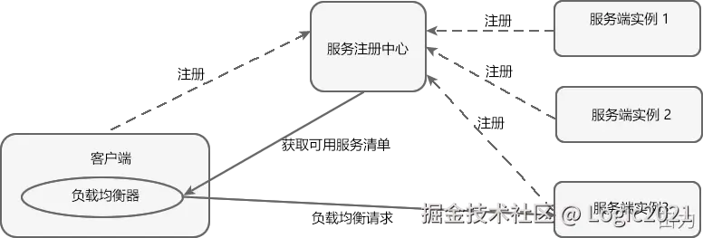 客户端负载均衡是将负载均衡逻辑以代码的形式封装到客户端上,即负载均衡器位于客户端。客户端通过服务注册中心(例如 Eureka Server)获取到一份服务端提供的可用服务清单。有了服务清单后,负载均衡器会在客户端发送请求前通过负载均衡算法选择一个服务端实例再进行访问,以达到负载均衡的目的;