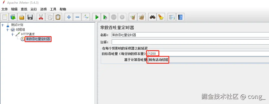 目标吞吐量设置为并发数*60,例如测试20并发数的用例设置为1200即可;选择基于所有活动线程计算吞吐量