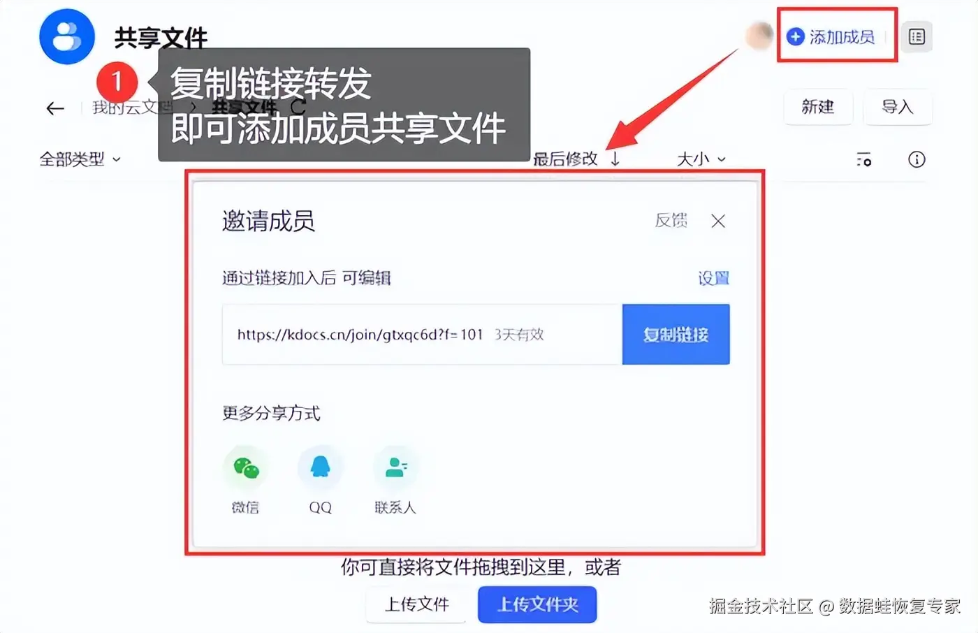 步骤3:点击 【添加成员】 ,复制链接转发即可邀请编辑,共享文件夹内的数据。