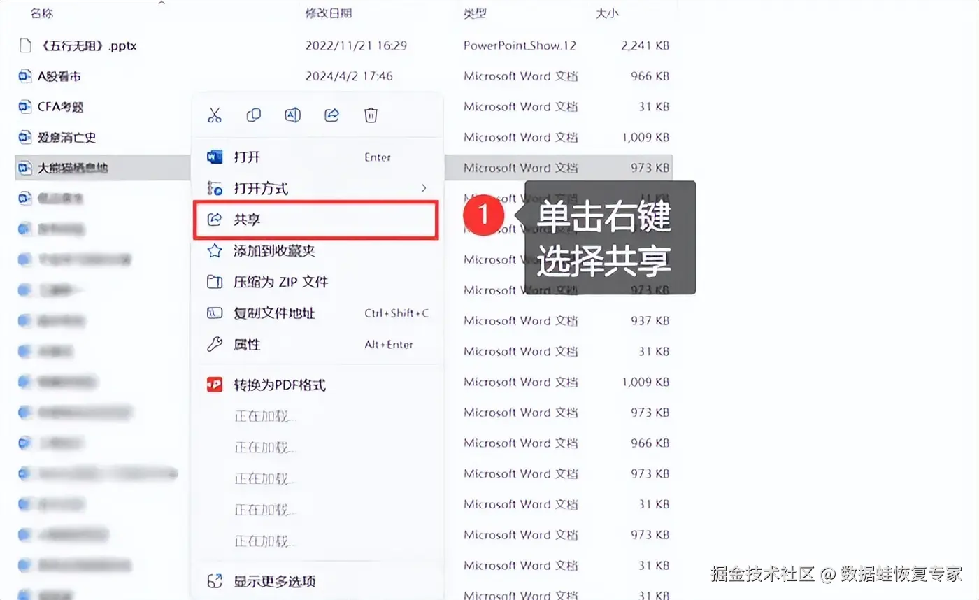 步骤1:在需要共享的文件夹中,选择文件,单击右键,点击 【共享】 。