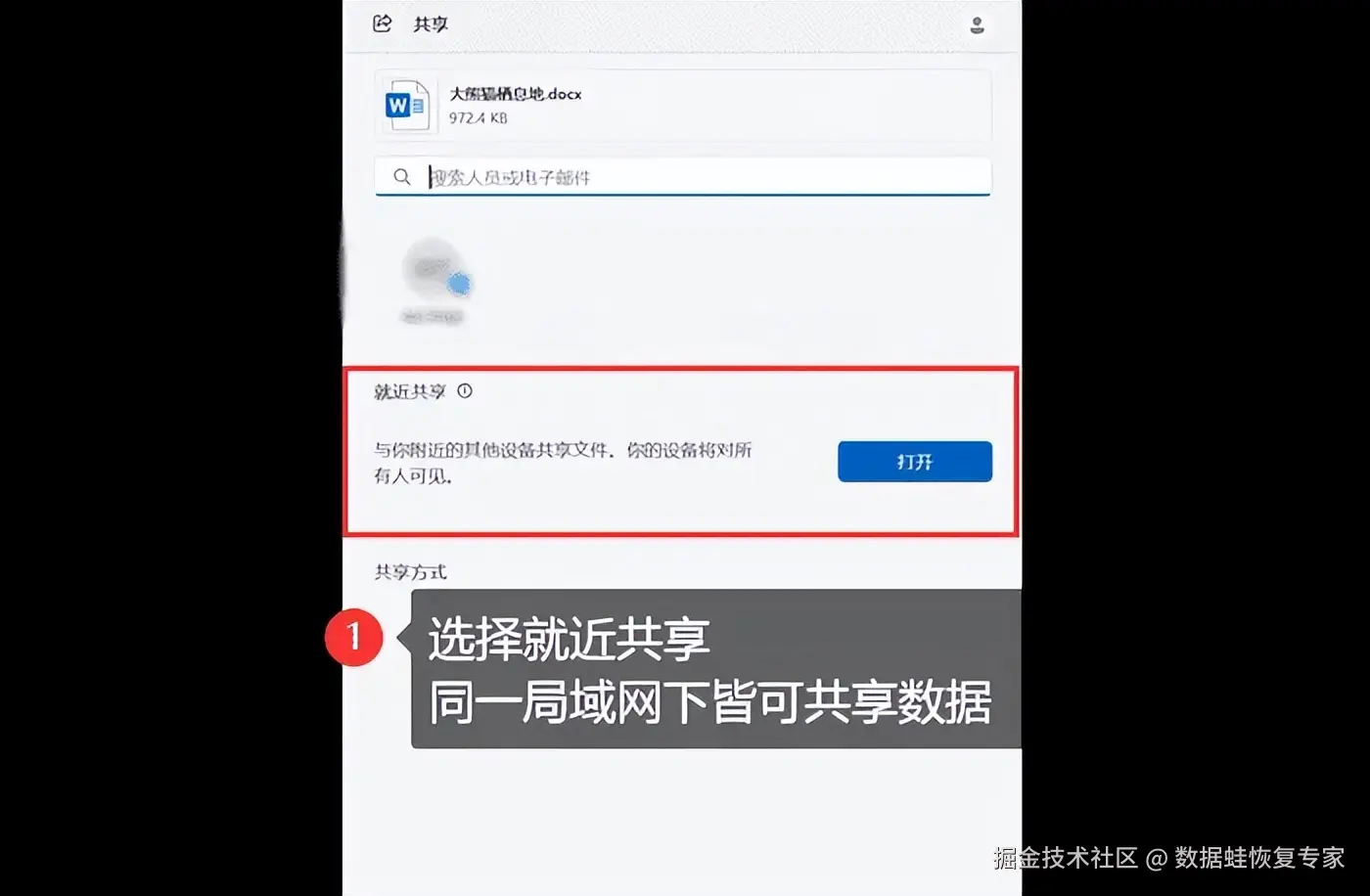 步骤2:在新的对话框中,选择 【就近共享】 ,打开后,同一局域网下的设备皆可查阅文件。