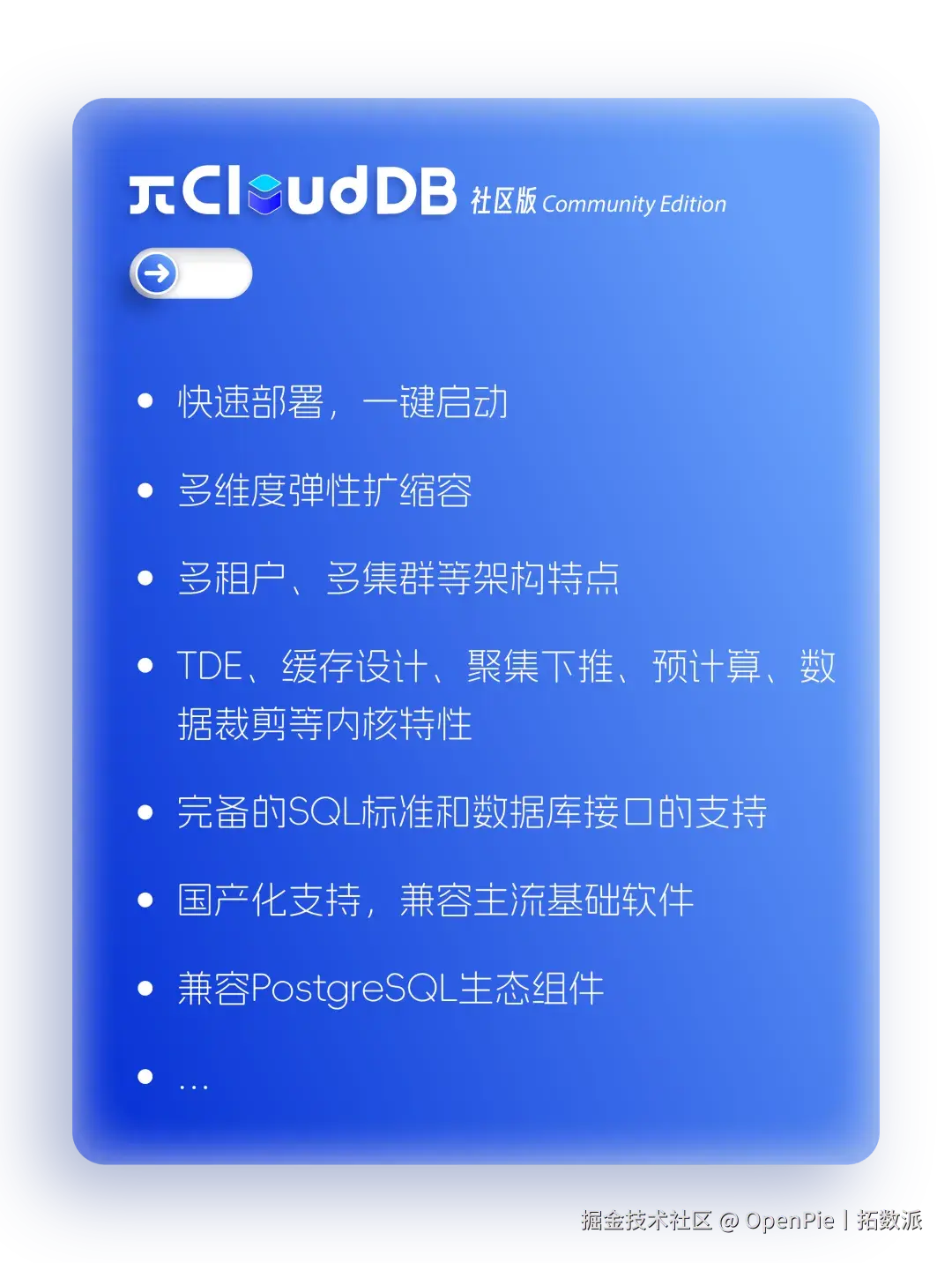 PieCloudDB Database 在eMPP(elastic MPP) 分布式专利技术、服务器无感知及透明加密(TDE)等多项核心技术加持下,为企业构建高安全,高可靠,高在线「坚如磐石」的云原生虚拟数仓,助力企业实现数据价值最大化。目前,PieCloudDB 面向国内市场提供云上云版、社区版、企业版和一体机四个产品版本,以满足用户不同场景需求。