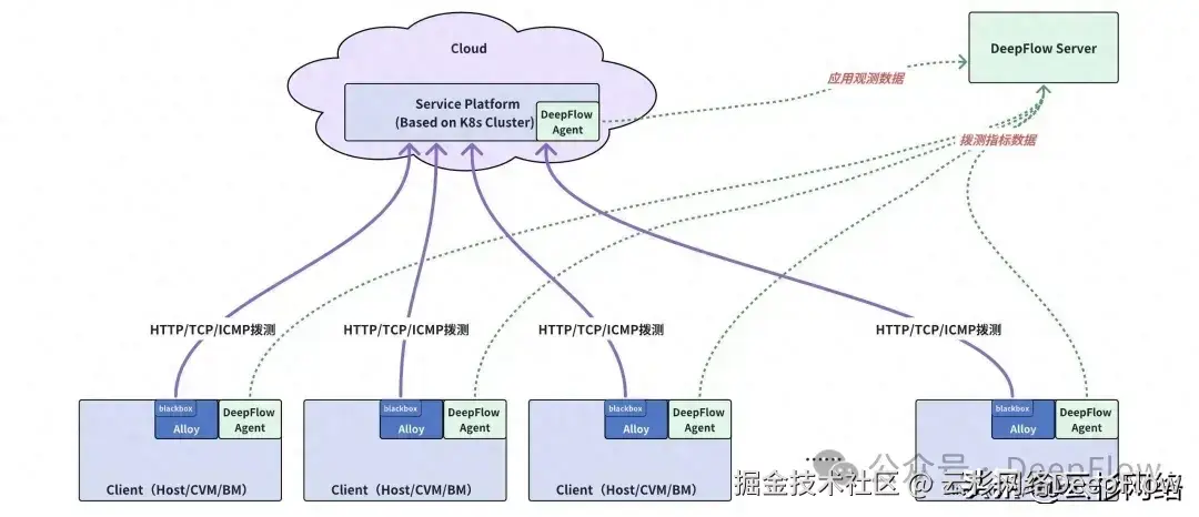 DeepFlow Server 汇聚 Blackbox 拨测指标数据和云端的应用调用数据,构建统一的数据观测能力。