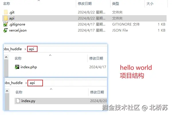 以下简单介绍 php 和 python 两种语言的 hello world,和有数据库连接的博客程序,第一步是后端入口文件都不能放在项目的根目录下,放在新建文件夹的 api 中,并添加 vercel.json(用于配置路由和分配内存等信息)。