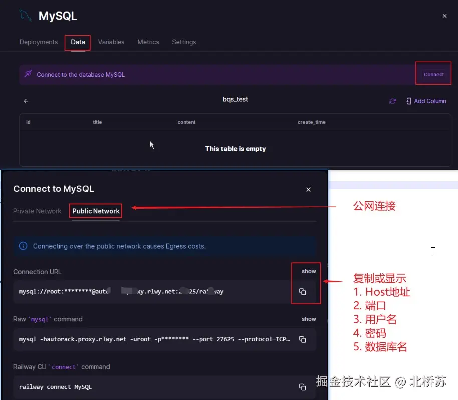 打开 Data,选择 “Connect” -> “Public Network”,Connection URL 就是该产品对外的连接 Host,用户密码,端口等信息。只需要复制下来,用于在程序中连接配置,Navicat for MySQL 图形化工具连接失败,我试过了。