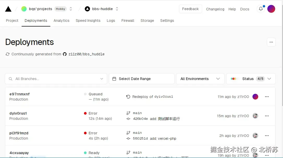 然后通过 Git 提交代码到仓库,如果发现没有部署成功,可以进入 vercel 平台的 Deployments 查看部署记录,有报错的根据信息修改。