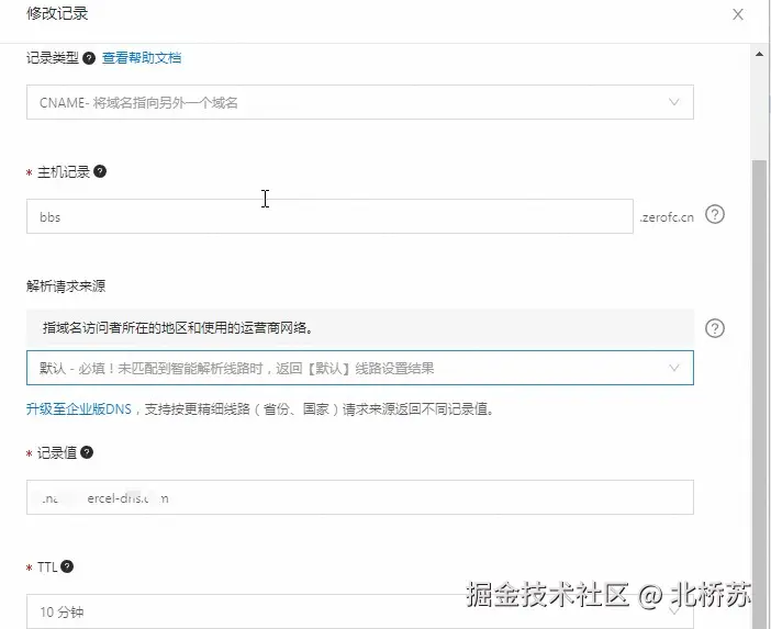 点击上面的 “Domains” 按钮(在 Visit 左边),输入即将要解析过来的域名,系统会展示需要用 CNAM 类型被解析的域名,复制该 value 去到自己的域名服务商控制台,添加一条 CNAME 解析记录。