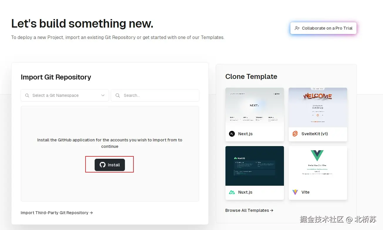 进入 vercel 官网,推荐使用 GitHub 账号登陆,配置主要完成仓库的代码导入,域名解析绑定,项目部署和相关参数设置。