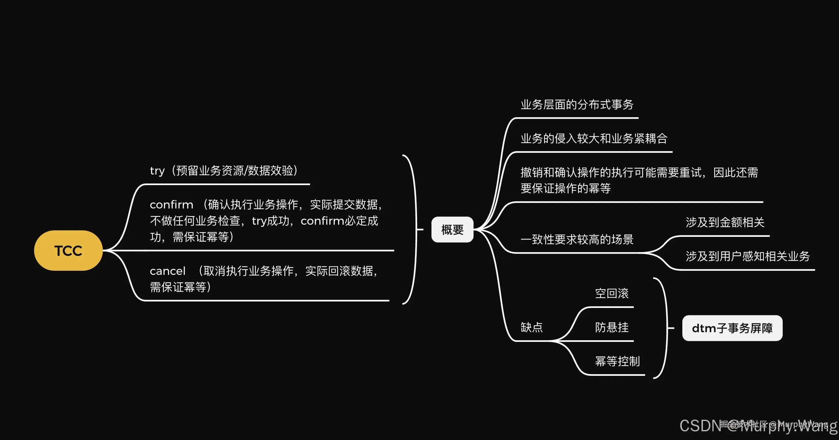 TCC分布式事务解决方案是在业务层面实现的原子性一致解决方案,原子性所有的事务要么一起成功要么一起失败。是最终一致方案比较有代表的,通常用来处理对于用户感知度比较强的分布式场景,比如转账,冲话费。不能转账已到账然后cancel。